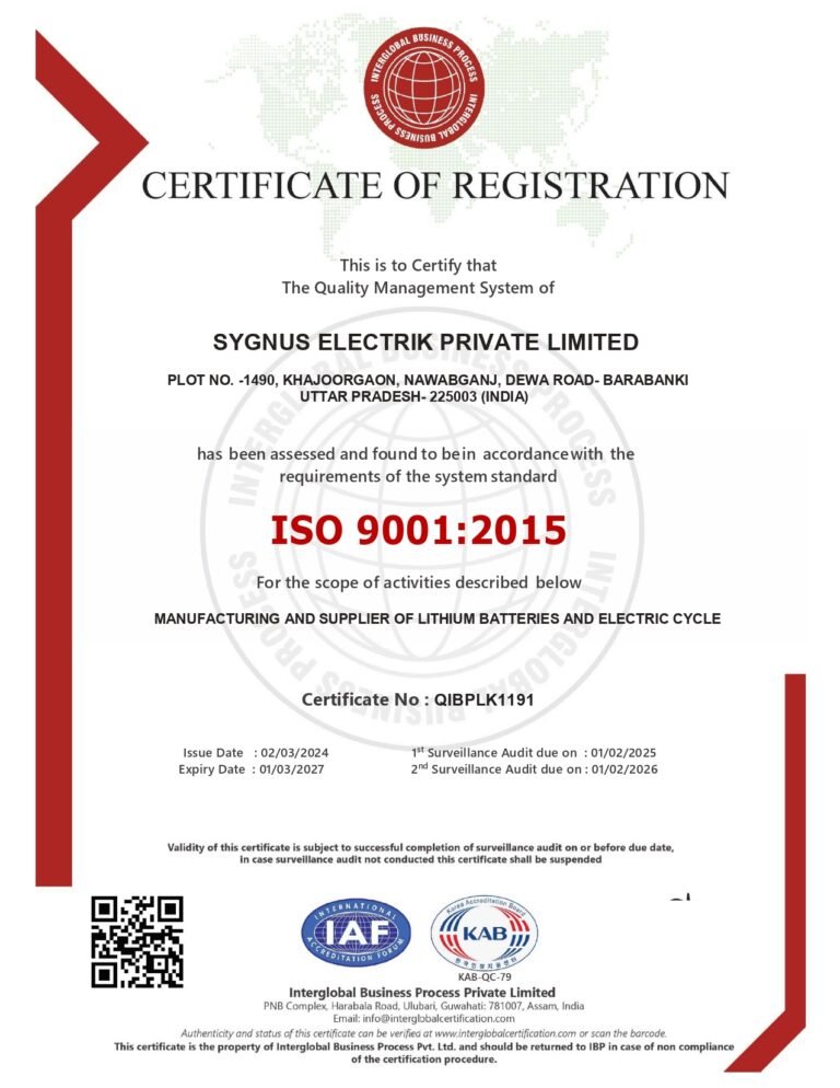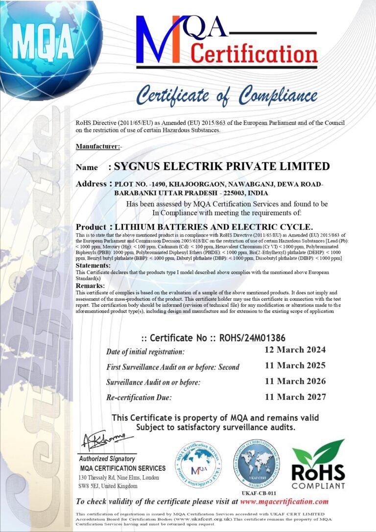 We are pleased to certify that our product’s technical file meets the requirements of the Low Voltage Directive (LVD) 2014/35/EU. Manufactured by SYGNUS ELECTRIK PRIVATE LIMITED, our address at Plot No. 1490, Khajoorgaon, Nawabganj, Dewa Road, Barabanki, Uttar Pradesh – 225003, India, pertains to Lithium Batteries and Electric Cycles. This certification remains valid subject to positive surveillance audits and applies exclusively to our manufacturing quality system for the specified models. For verification, please visit www.mqacertification.com.