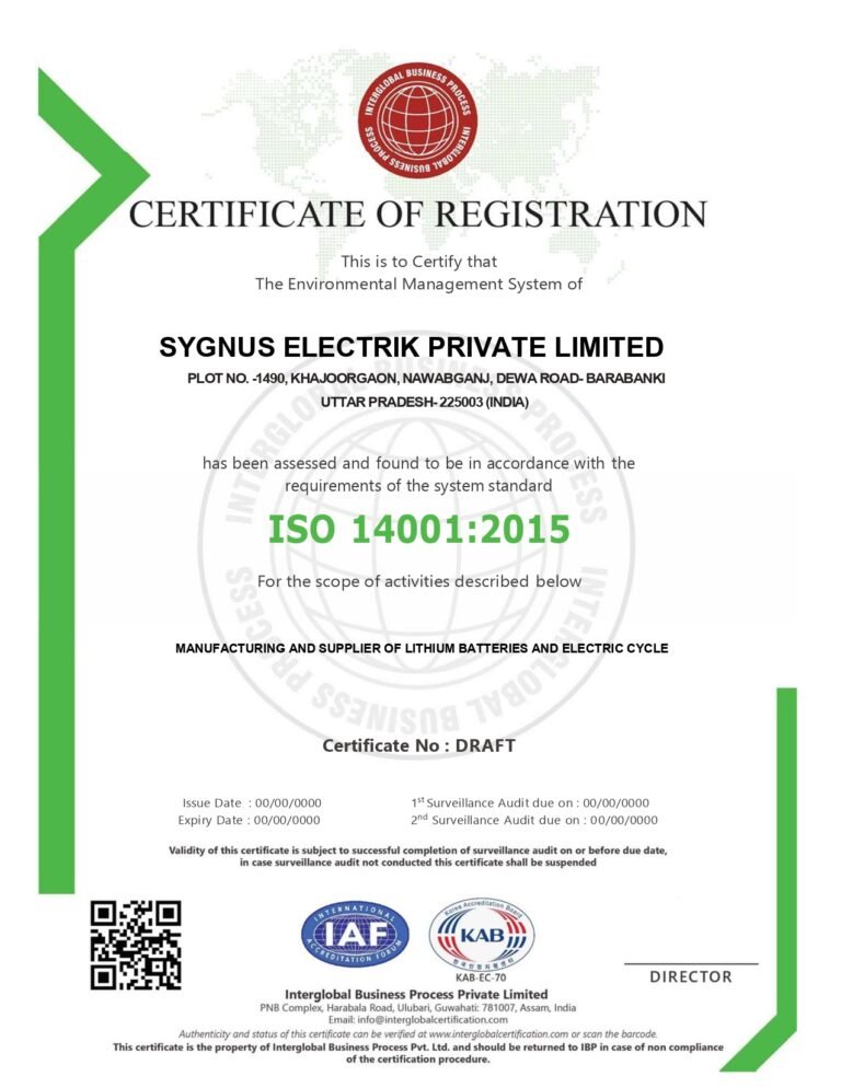 This is to certify that the Environmental Management System of SYGNUS ELECTRIK PRIVATE LIMITED, located at Plot No. 1490, Khajoorgaon, Nawabganj, Dewa Road, Barabanki, Uttar Pradesh – 225003, India, has been assessed and found to be in accordance with the requirements of the system standard ISO 14001:2015 for the scope of activities described as Manufacturing and Supply of Lithium Batteries and Electric Cycles.